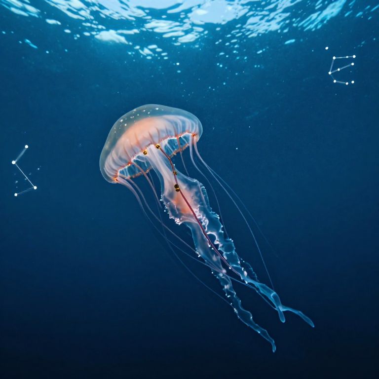 In an ocean of ink, jellyfish with mechanical wings migrate using constellations reflected on the water’s surface as navigational guides.