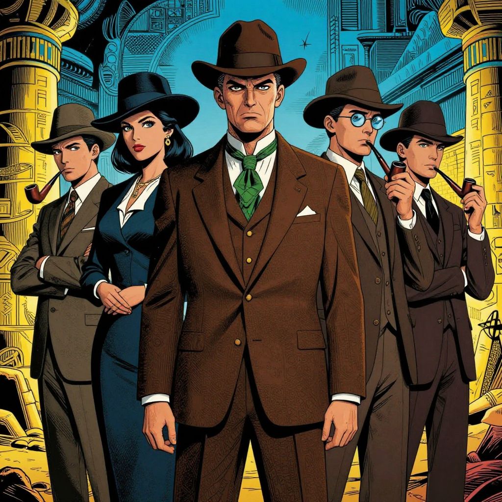 Comic-style drawing of four stylish, suited detectives in brown hats and suits, standing confidently against a blue and yellow backdrop.