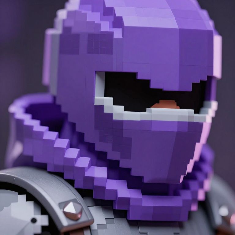 Photograph of a pixelated Minecraft character with a purple, blocky, helmet-like headpiece and a matching scarf. The character has a small, rectangular black eye with a white glint, and a small square of orange visible beneath the eye. The background is blurred, creating a bokeh effect, and is predominantly dark gray. The character's body is also pixelated, with a mix of purple and gray blocks, and a light source reflecting off the left shoulder. The image has a sharp focus on the character's face and upper body.