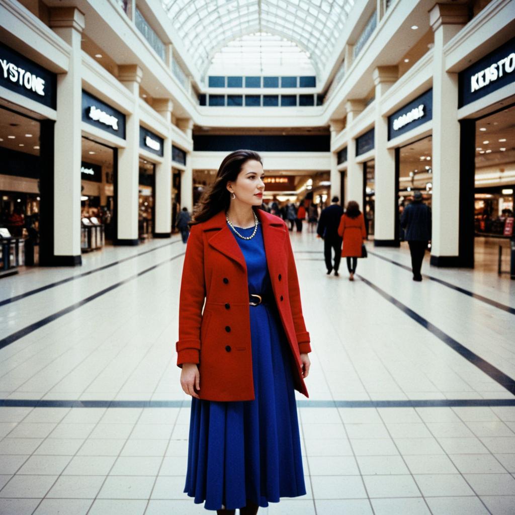 Keystone Mall, woman in red coat and blue dress standing in a mall