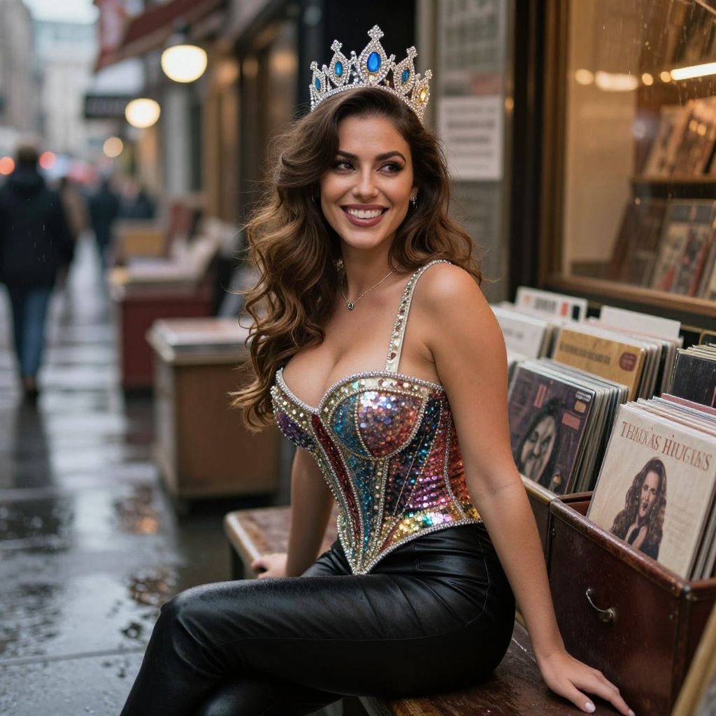 Photograph of a smiling woman with long, wavy brown hair, wearing a sparkling, multicolored sequin corset and black leather pants. She sports a silver tiara with blue gemstones. She is seated on a wooden bench outside a record store, with a blurred urban street and streetlights in the background. The store's window displays several vinyl records, including one with a woman's face on the cover. The wet pavement reflects the streetlights, adding a glossy texture to the scene. The woman's confident pose and radiant smile highlight her regal, glamorous appearance.