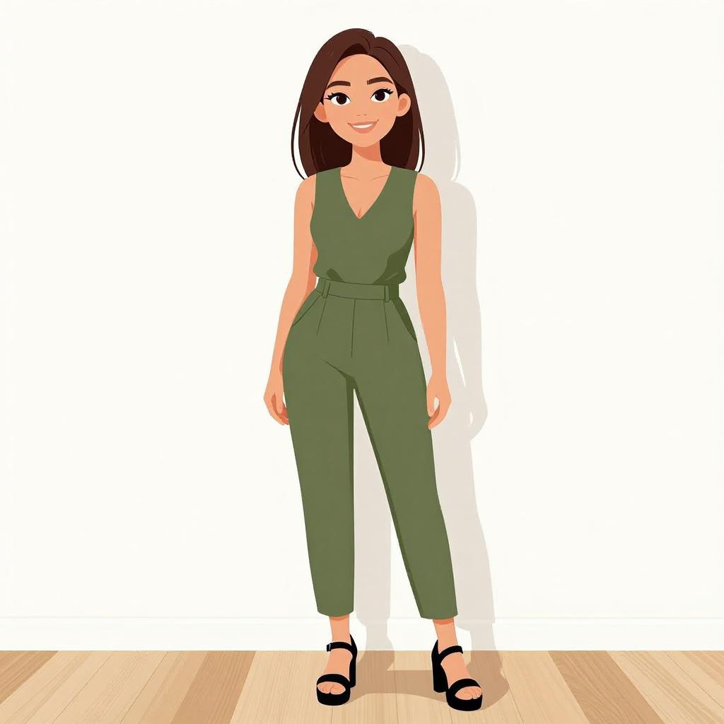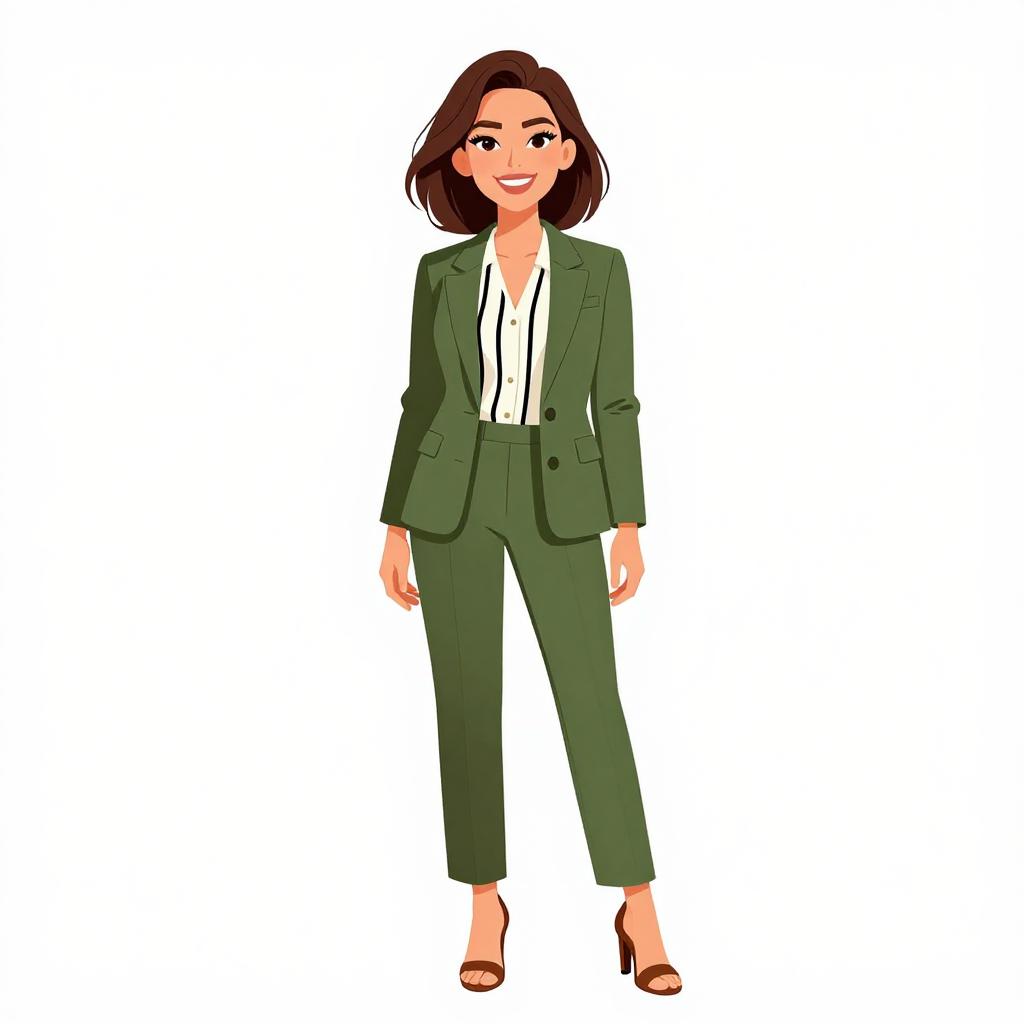 Woman with pretty face and pretty hair. smiling Woman, modern business casual, lime green suit, relaxed-fit blazer, single button closure, matching belt with square buckle, straight-leg trousers, plain white tank top, minimal strappy heels, no visible jewelry, neutral studio background --sref 1467