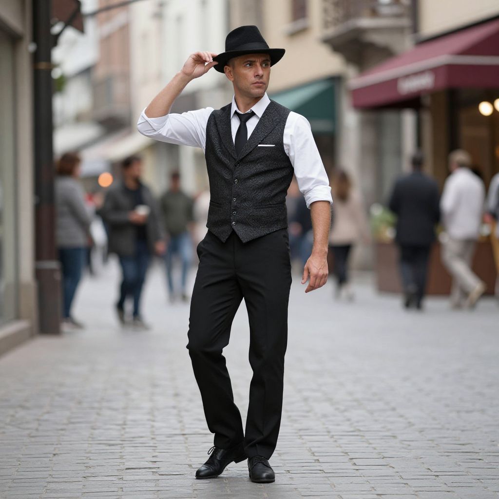 Photograph of a handsome man in black vest, white shirt, black pants, and bowler hat, adjusting his hat on a cobblestone street