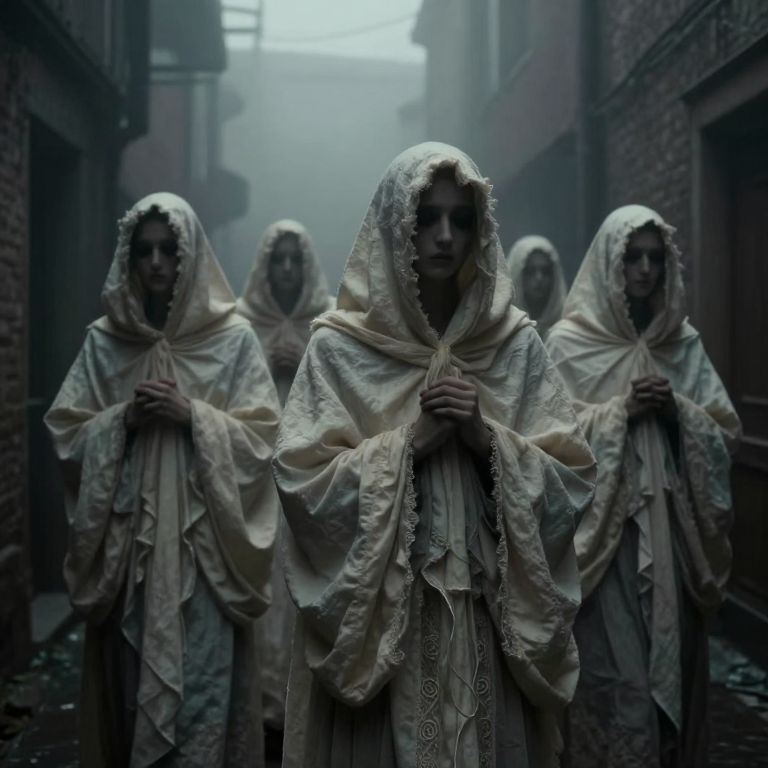 In a fog-shrouded alley where whispers of the past linger, spectral figures draped in shrouds stand in solemn procession, their hollow eyes bearing witness to the transience of memory and the weight of unspoken truths.