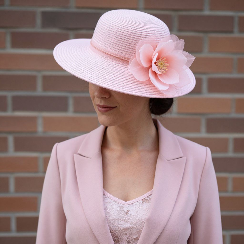 Woman wearing a stylish pink hat adorned with a large pink flower corsage, paired with a matching pink blazer and lace top, standing against a brick wall backdrop.