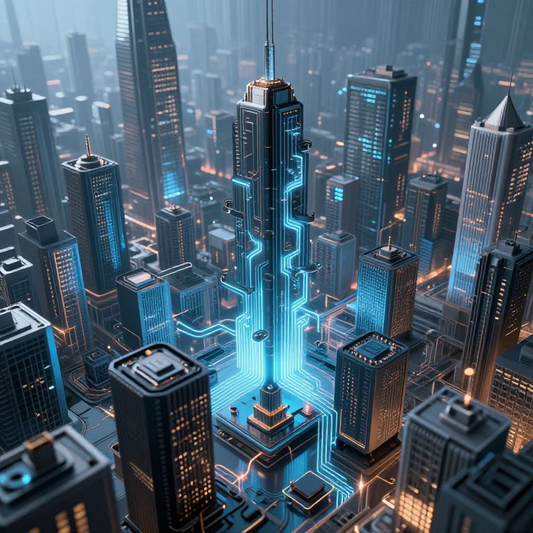 Digital artwork of a futuristic cityscape featuring a central skyscraper with glowing blue neon lines, surrounded by dark, high-rise buildings. The scene is illuminated