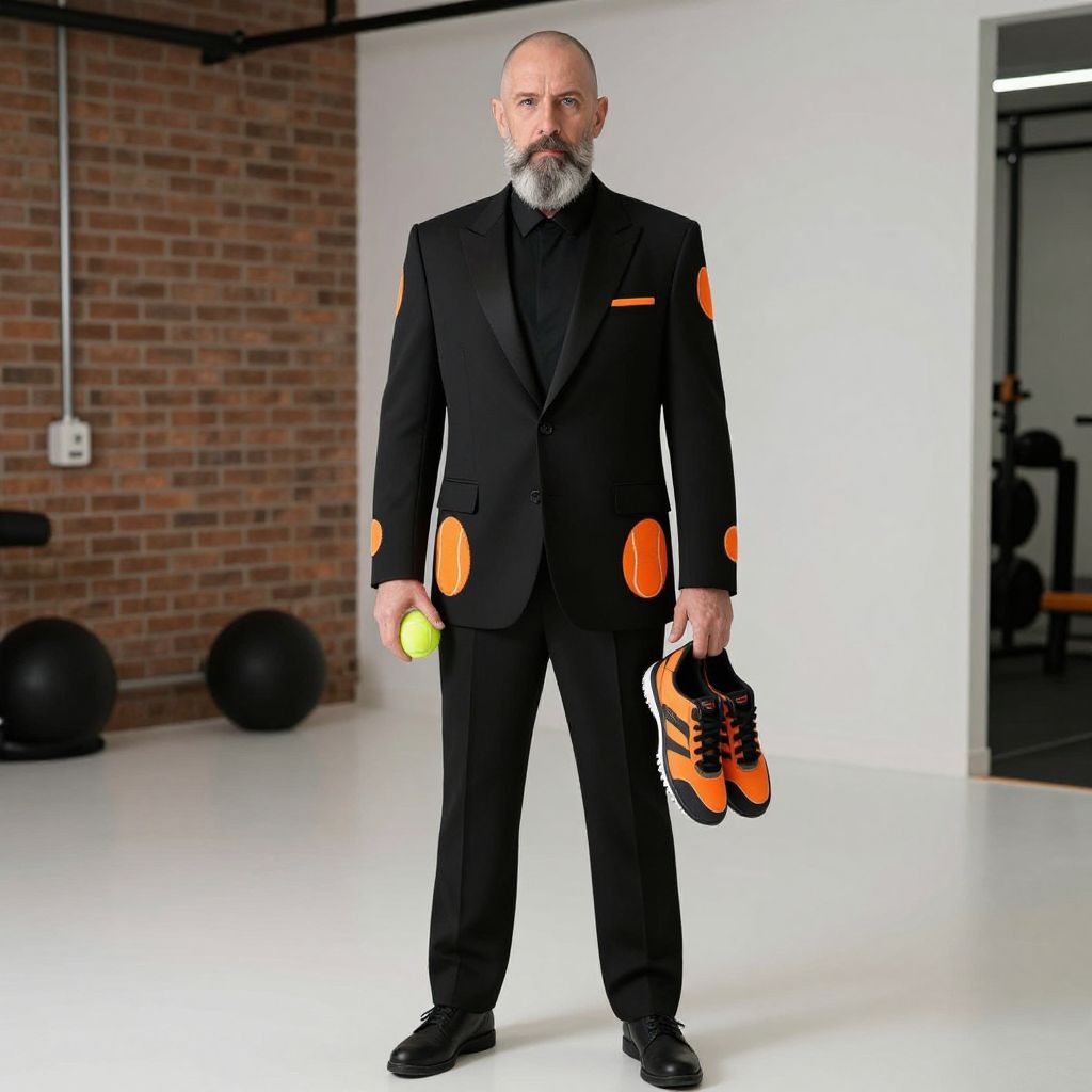 An elegant man in his 50s with a well-groomed grey beard, sharp blue eyes, and a neatly shaved head wears a high-end tennis ball fancy dress — a tailored black suit with orange tennis ball patches on the lapels, sleeves, and back. He stands in a modern indoor gym with exposed brick walls and white flooring, holding a tennis ball with one hand and a pair of tennis shoes with the same pattern. The lighting is clean and professional, with subtle shadows and reflective surfaces. Photorealistic, realistic fashion portrait style.