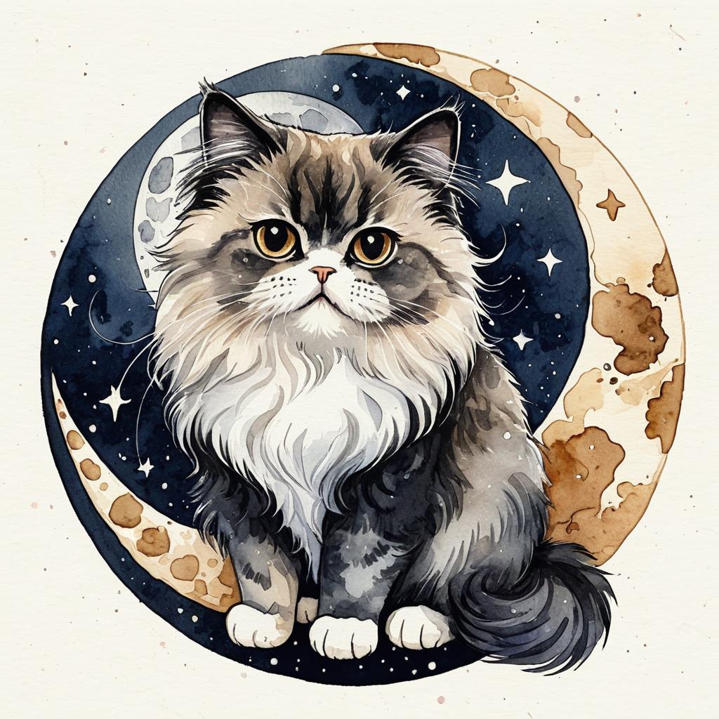 Watercolor Persian Cat with Waxing Gibbous Moon