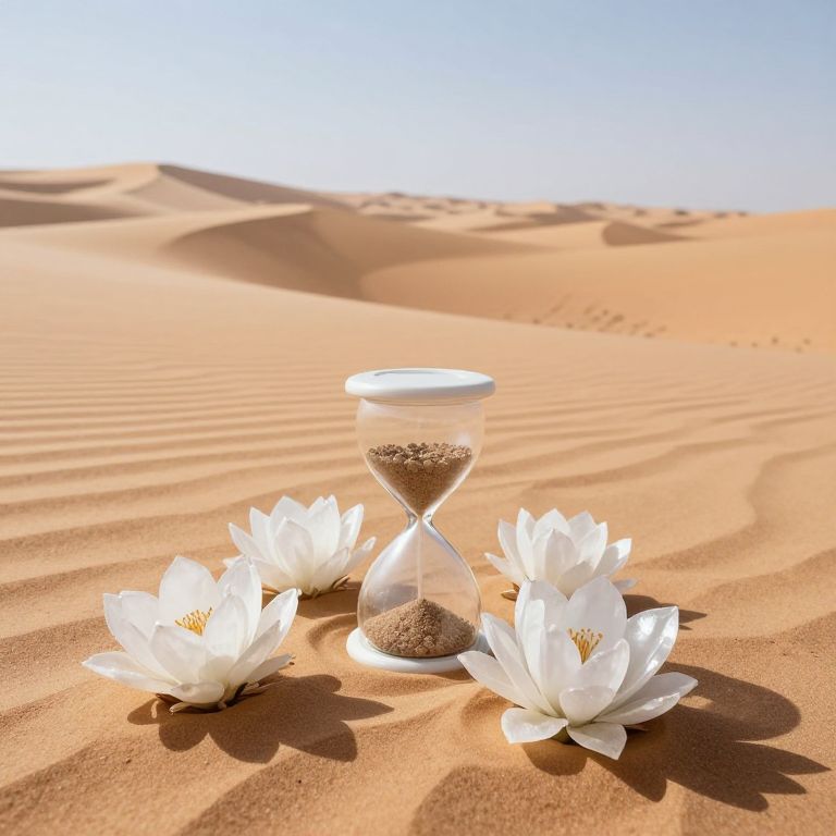 Photograph of a clear glass hourglass with sand, surrounded by three white lotus flowers, on sunlit golden sand dunes.