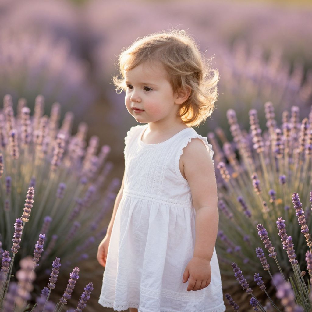 Radiant innocence blooms amidst a sea of purple whispers, as a toddler stands bathed in golden sunlight, embodying the boundless wonder and timeless serenity of childhood.