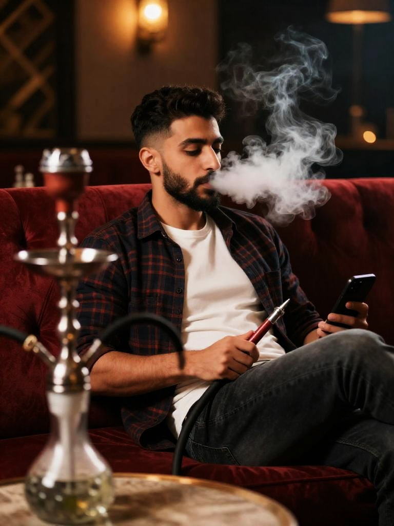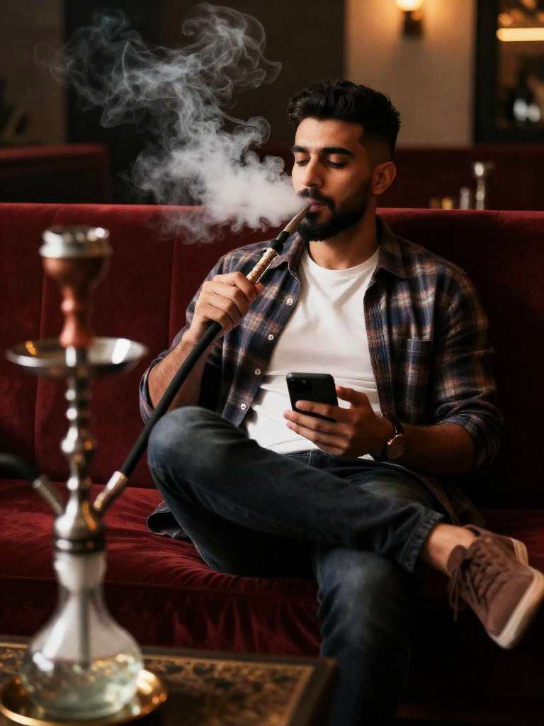 Man smoking shisha, relaxed adult man sitting on a plush sofa in a lounge, dark-haired Middle Eastern man with short beard and fade haircut wearing casual t-shirt layered under an open checked shirt with dark jeans, holding the shisha hose in one hand while looking at his phone in the other, dense cloud of smoke drifting from his mouth, ornate hookah with glass base placed on a low table in the foreground, rich warm lighting, deep red upholstery, cinematic lifestyle photo, realistic, high resolution