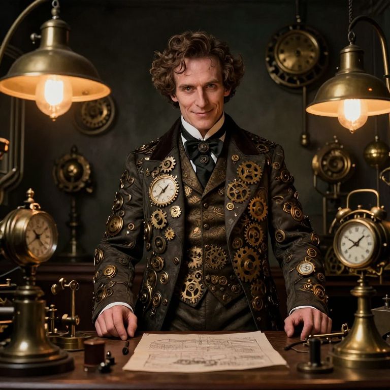 Imagine an elaborate steampunk-inspired portrait featuring a cryptic Victorian-era inventor standing boldly amidst a backdrop of mechanical wonders. The inventor, dressed in a suit embellished with gears and clockwork patterns, conveys wisdom and guile through their piercing gaze and enigmatic grin. This scene is viewed from an 'under-the-table' angle, revealing the intricate workings of the inventor's devices while hinting at concealed plans and unfulfilled aspirations. The soft luminescence emanating from various brass lamps casts striking shadows over the mechanical components, creating a captivating contrast that showcases the harmonious blend of technology and creativity in this realm of invention and clandestine affairs.