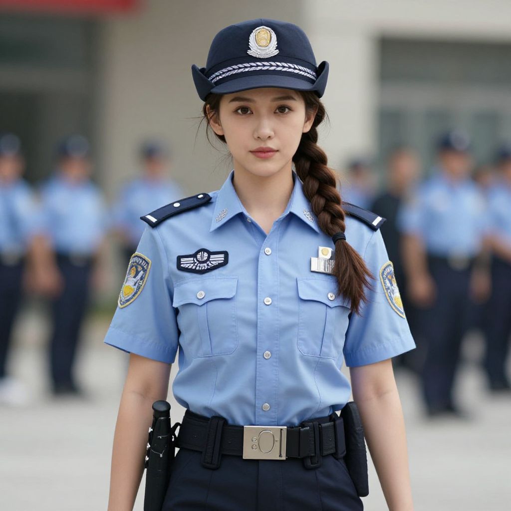 Photograph of an Asian female police officer with a braid, light blue uniform, black cap, badge, and belt, standing in front of blurred