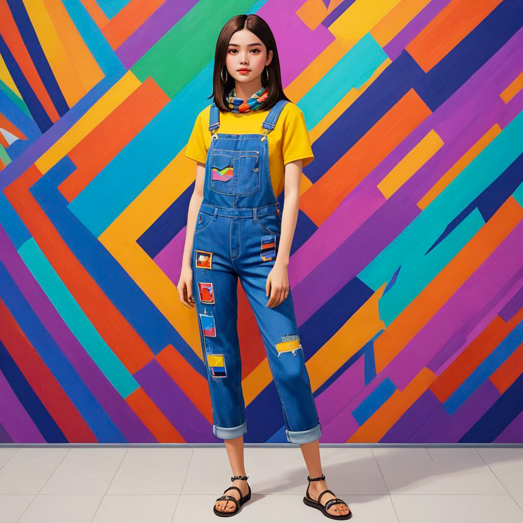 Teenage girl, shoulder-length straight hair, slender sims 4 outfit, virtual fashion flair, crop top, overalls, trendy sandals, bohemian scarf, edgy, abstract colors studio background