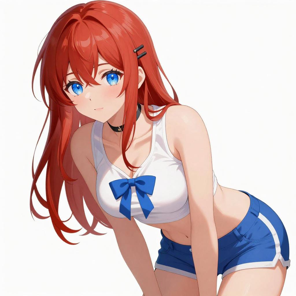 Digital anime-style illustration of a young woman with long red hair and bright blue eyes, wearing a white crop top adorned with a blue bow and blue athletic shorts. The character has fair skin, a slim waist, and an athletic build, posing leaning forward against a white background. She accessorizes with a black choker and hair clips, presenting a cute and casual summer look.