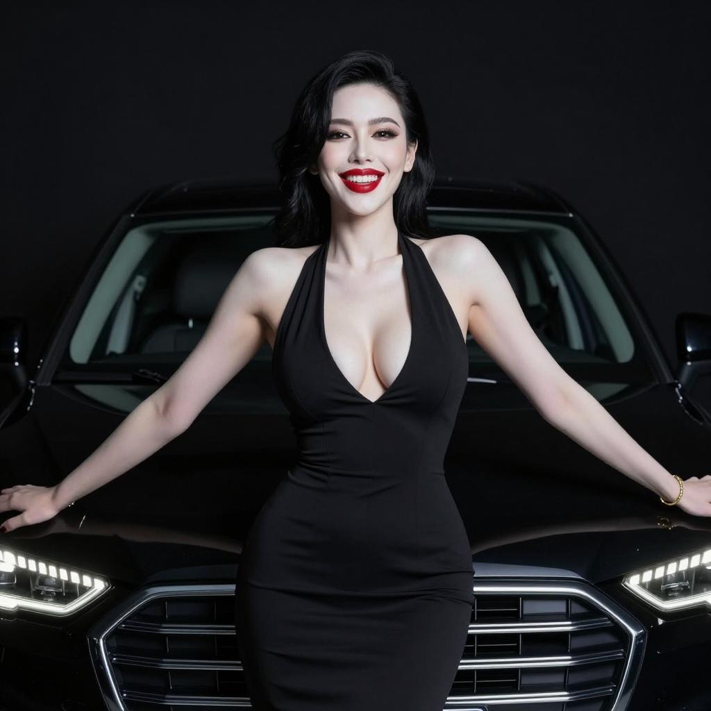 Woman with pale skin and black hair, wearing a low-cut black dress, standing in front of a black car. She has a wide smile, red lipstick, and her arms are outstretched. The car is in the background, with its headlights and windshield visible. The background is completely black. The woman's dress reveals a significant amount of cleavage. The car has a sleek, modern design. The woman wears a gold bracelet on her right wrist. The image is a photograph with dramatic lighting highlighting the woman and car.
