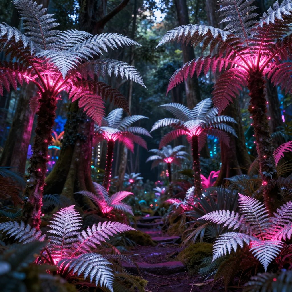 Photorealistic image of a glowing neon forest at night, with silver fern trees lit by vibrant pink LED lights. Rave vibe, colorful uplighting, ultra-realistic octane render, high-definition, neon gel lighting creating a fantastical radiant forest atmosphere