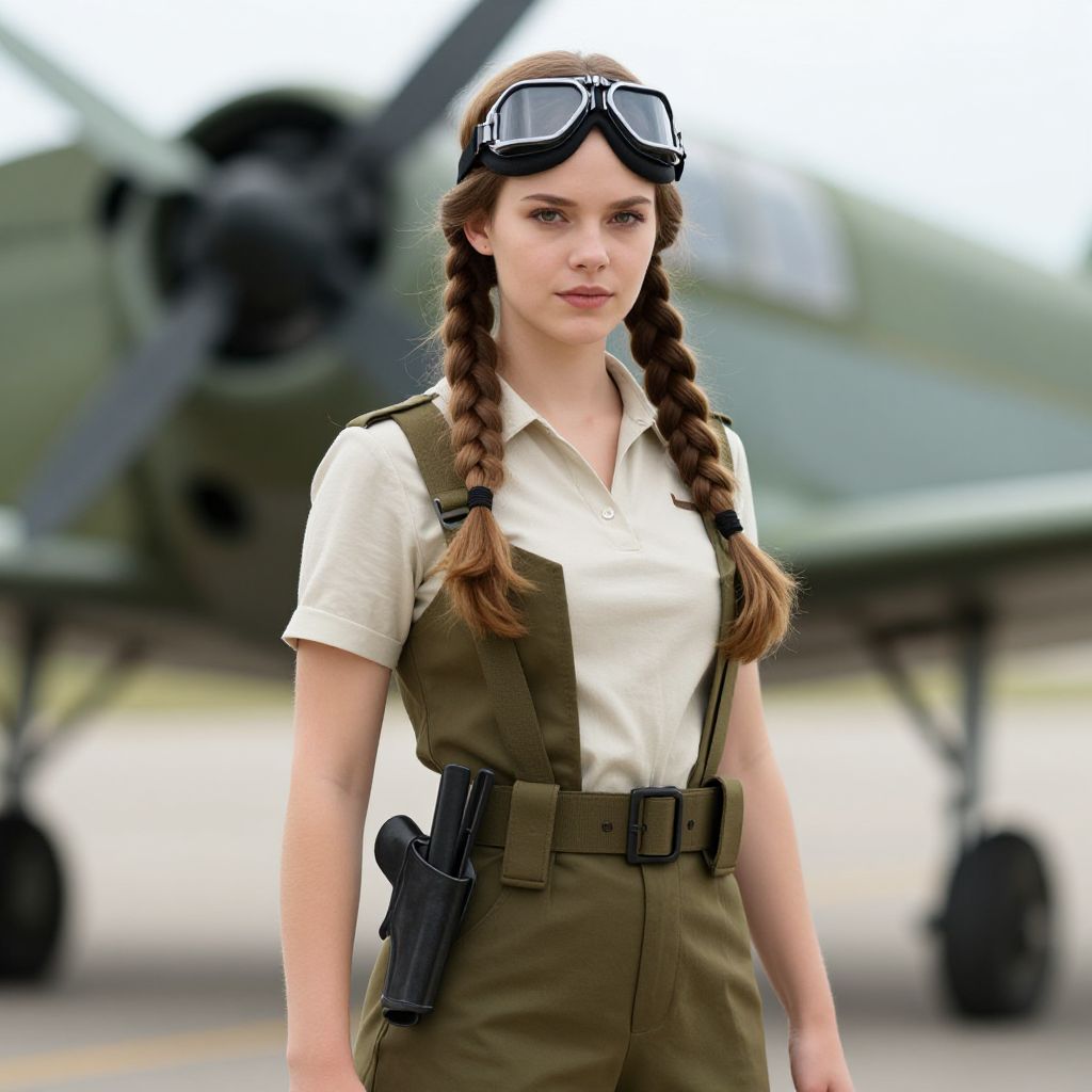 Photograph of a young woman with fair skin and blue eyes, wearing black aviator goggles with a headband, black earmuffs, and a brown bomber jacket over a white shirt. Her long, straight brown hair falls over her shoulders. She has a neutral expression and is centered against a plain, light gray background. The image has a slightly glossy, studio-lit quality, emphasizing her clear skin and the textures of her clothing and accessories. The style is modern and clean, with a focus on the aviation-themed accessories.