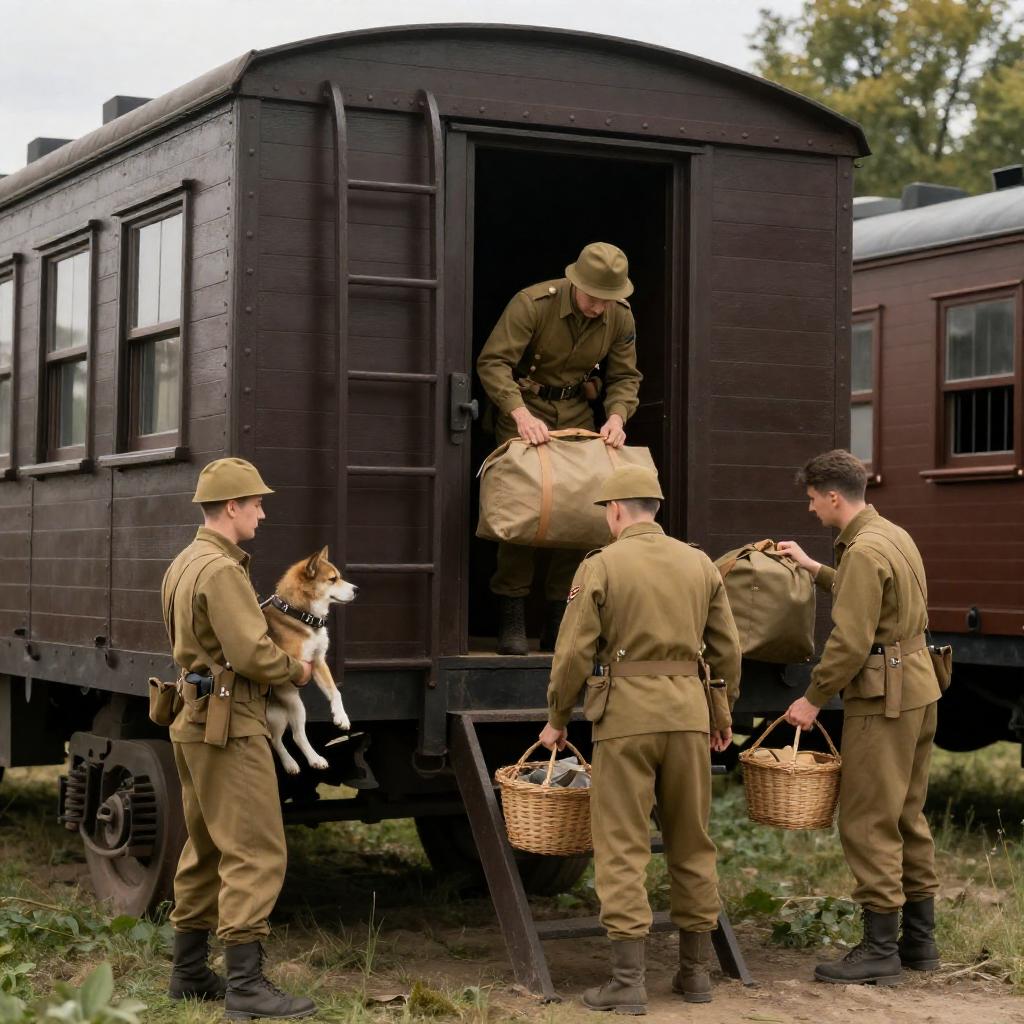 Photograph of a group of soldiers in World War II-style uniforms unloading luggage and people from a dark brown wooden train car. A soldier holds a dog on the left, while others assist with bags and baskets. The train car has a metal ladder and barred windows. The scene is outdoors with greenery in the background.