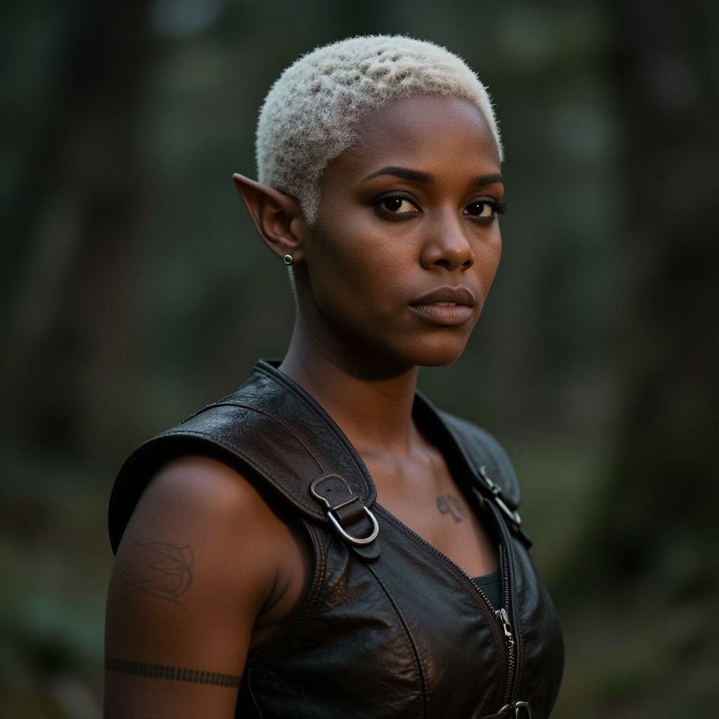 "Neural Implant a young elven woman with short platinum hair, dark olive skin, and tattoos, wearing a leather vest. forest background, cinematic lighting, 4K, UHD, highly realistic, fantasy movie,"