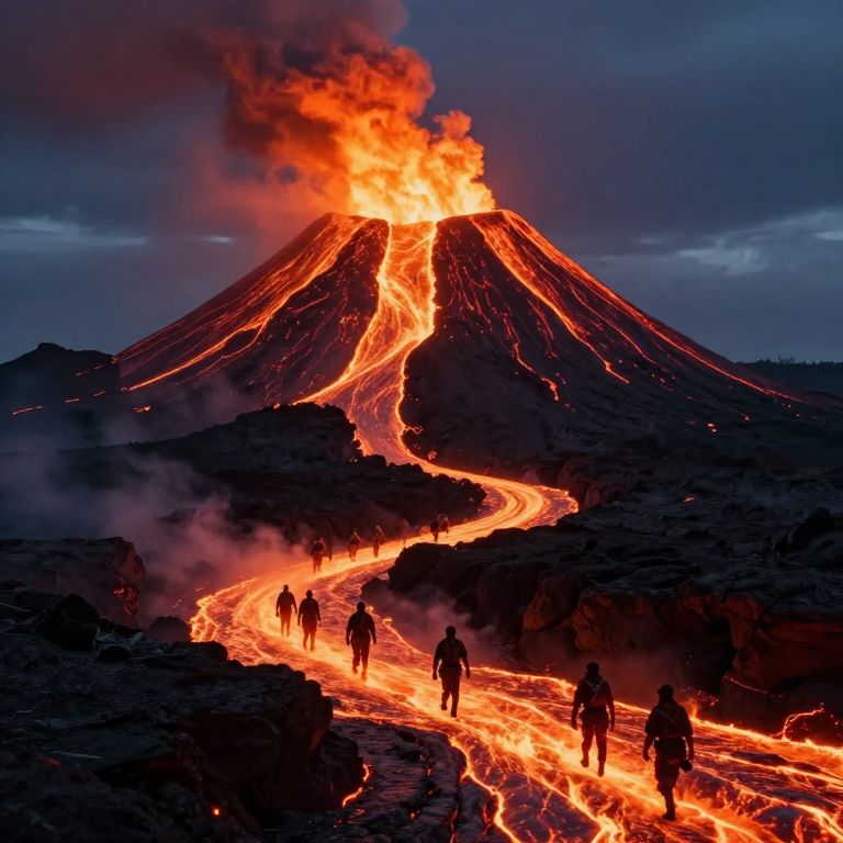 Photograph of an erupting volcano at night. The volcano's peak is ablaze with bright orange and red flames, emitting thick black smoke into a dark, cloudy sky. Lava flows down the sides in glowing, viscous rivers, illuminating the rocky landscape. Silhouetted against the lava are eight people walking along a path that snakes through the molten terrain. The scene is dramatic, with intense contrasts between the fiery lava and the dark, shadowy foreground. The texture of the rocky ground is rough, and the overall mood is both awe-inspiring and perilous.