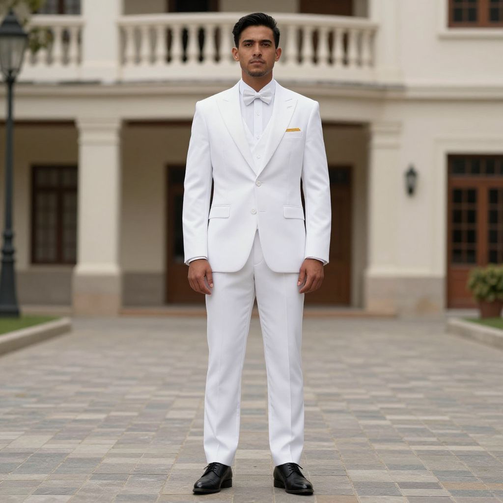 White Suit Groom Costume, man in a white suit standing in front of a building