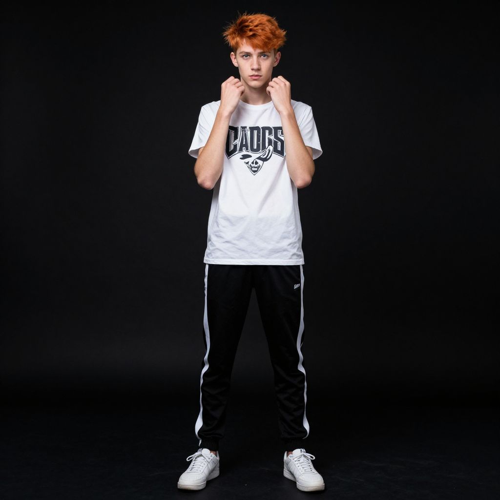 Full body portrait of a tall lanky teenage boy with messy orange hair and blue eyes standing confidently against a black background. He wears a white graphic t-shirt, black track pants with white stripes, and white sneakers. The boy's hands are raised near his face, and he gazes directly at the camera, creating a strong, focused expression.