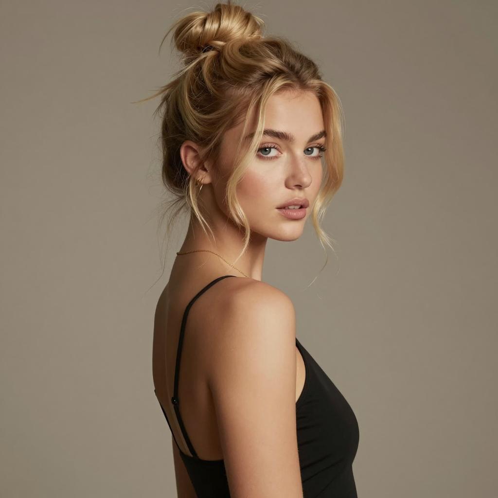 Blonde woman with light skin and delicate features. She has her hair in a loose, messy updo with strands framing her face. She wears a black, thin-strapped, low-cut top. Her expression is neutral with slightly parted lips. Background is a gradient from light beige to dark brown. She is slightly turned to the right, looking into the camera. She wears a thin gold necklace. The image is a photograph.