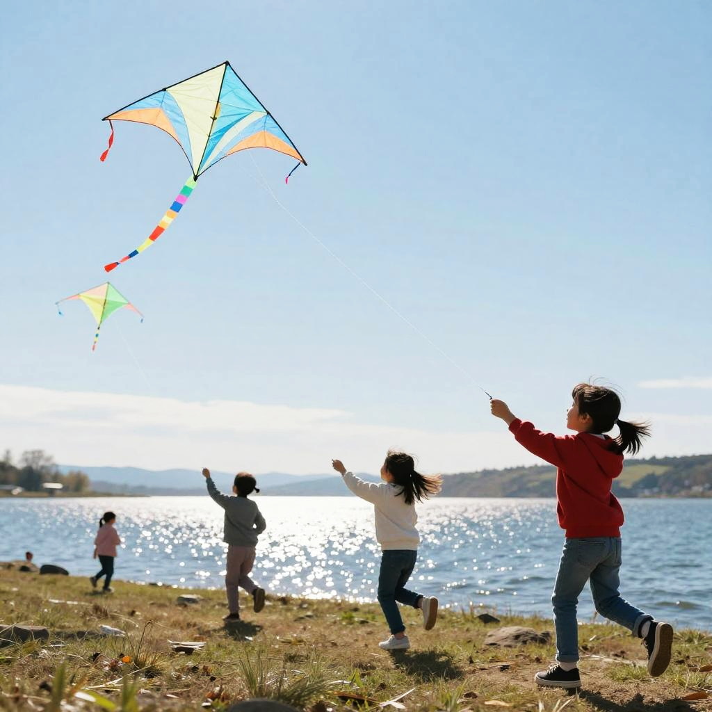 Lighthearted depiction of children flying kites on a breezy day near a sparkling lake, clear blue sky, dynamic movement, bright and uplifting mood, detailed natural surroundings, evoking a sense of freedom and pure happiness.