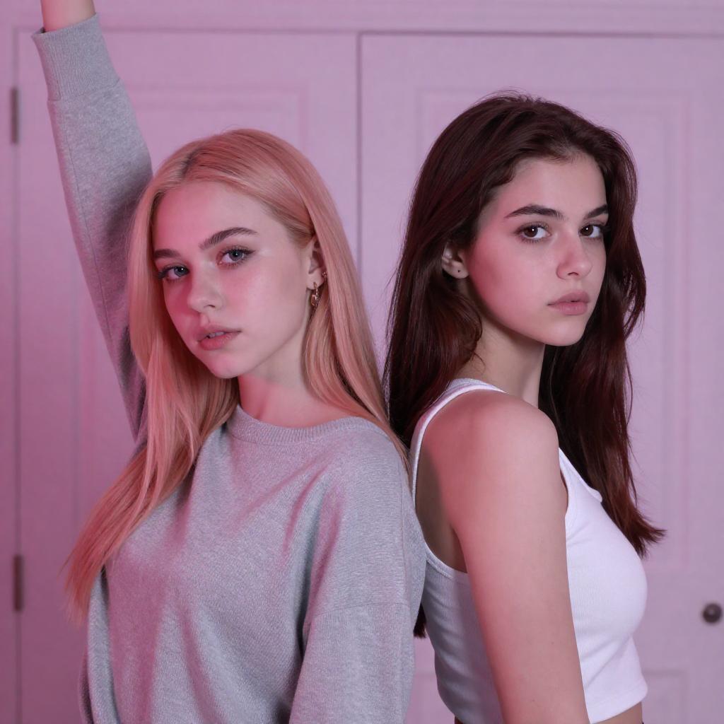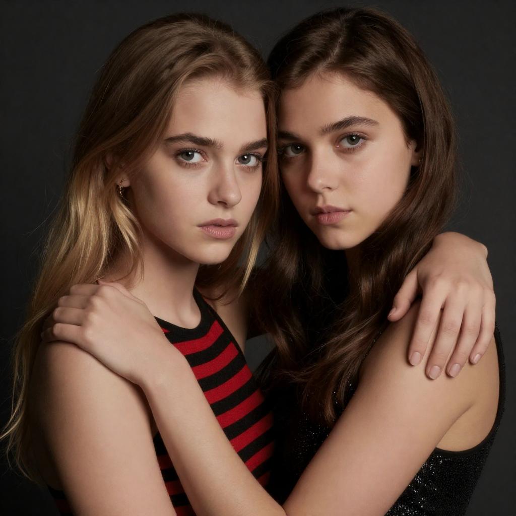Photograph of four young women sitting closely on a black leather couch. Woman on left with brown hair, serious expression, head resting on hand. Center woman with blonde hair, tongue out, playful expression. Rightmost woman with long brown hair, smiling. Fourth woman with light brown hair, kissing air, smiling. Dark background with partially visible posters. Casual clothing. Warm indoor lighting.