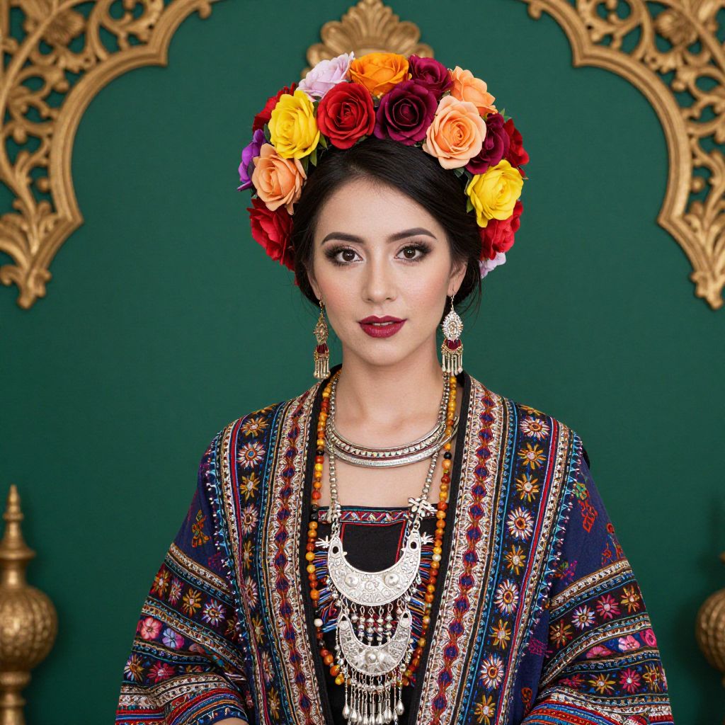 A woman in elaborate, colorful attire with floral headpiece and intricate details, set against a green background with ornate decorations.