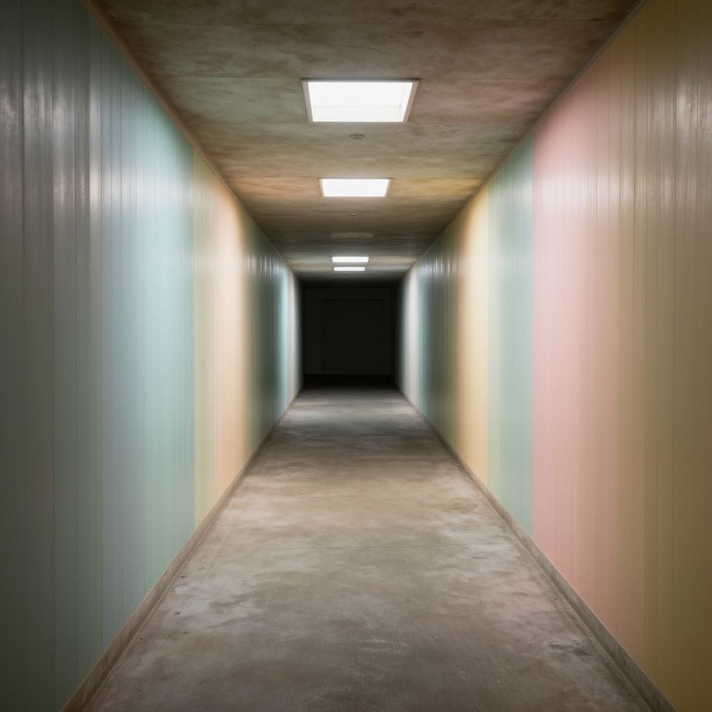 Empty, narrow underground corridor with concrete floor and ceiling, featuring pastel-colored vertical panels on both side walls. A small rectangular skylight in the ceiling lets in natural light, creating soft, colorful reflections on the walls. The corridor fades into darkness at the far end.