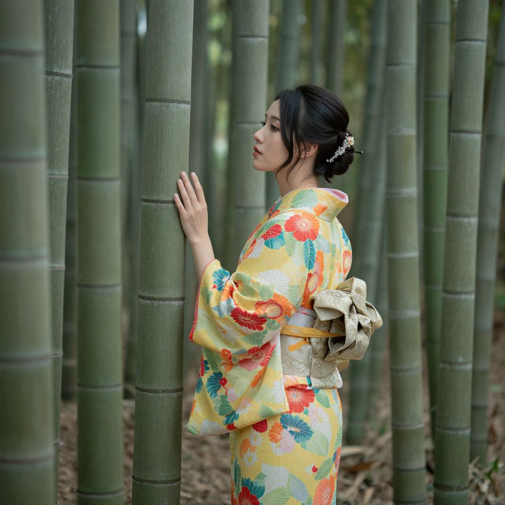 Serenity whispers through the bamboo forest as a woman in a vibrant kimono stands in quiet contemplation, her presence a harmonious blend of tradition and nature, evoking a timeless sense of peace and cultural elegance.