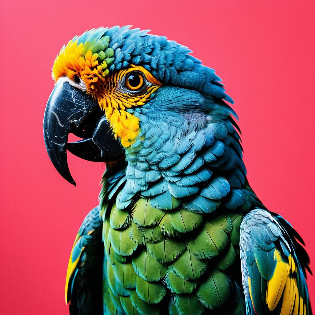 Vivid artwork of a lively pet parrot portrayed in the style of Andy Warhol, featuring vibrant layered colors including green, blue, yellow, red, and orange feathers. The parrot is set against a light background with black dotted accents, emphasizing a pop art aesthetic.