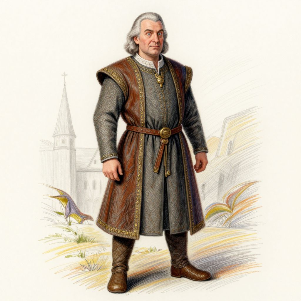 This is a digital illustration of an elderly white man with gray, shoulder-length hair. He is dressed in a long, dark gray, medieval-style tunic with gold embroidery, brown leather belt, and brown boots. His sleeves are slightly puffed, and he wears a white collar under the tunic. He stands with a stern expression, looking to the side. The background features a faintly drawn, white church steeple and colorful, abstract grass and leaves. The illustration has a detailed, realistic style with a focus on historical clothing.
