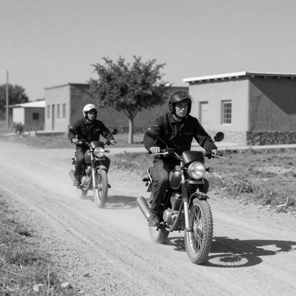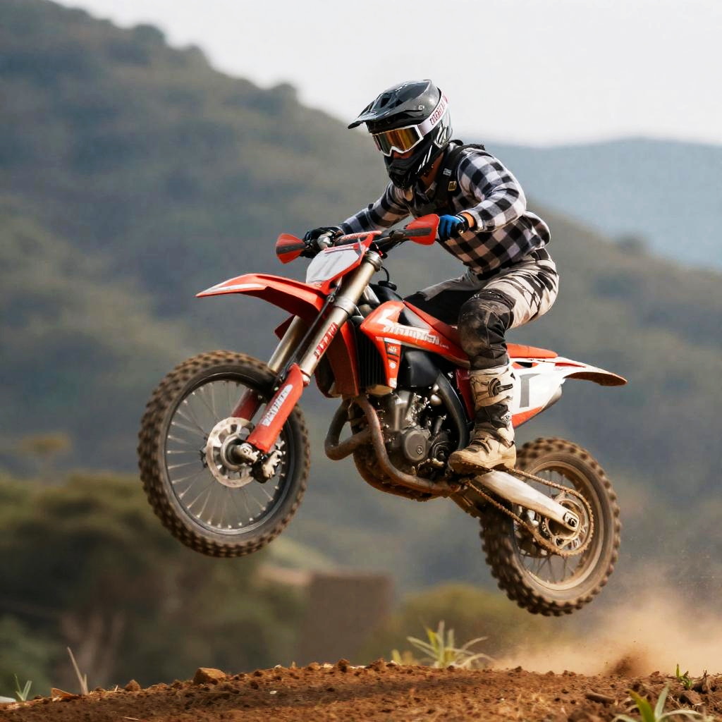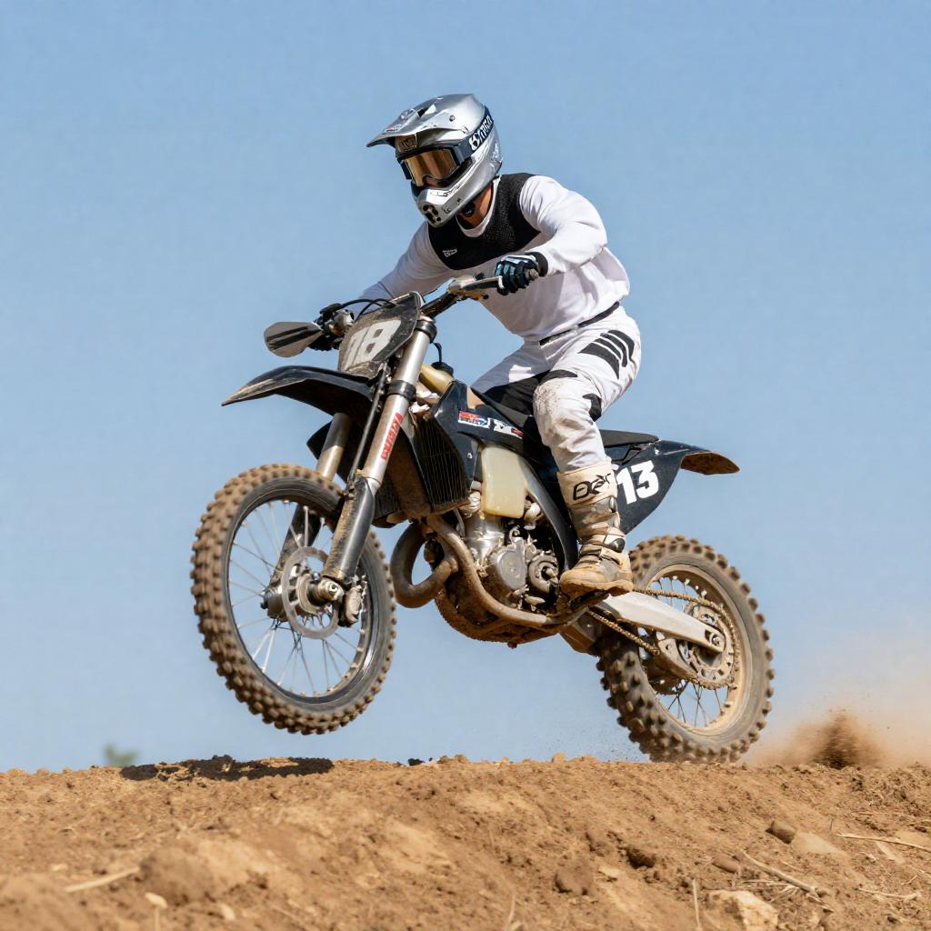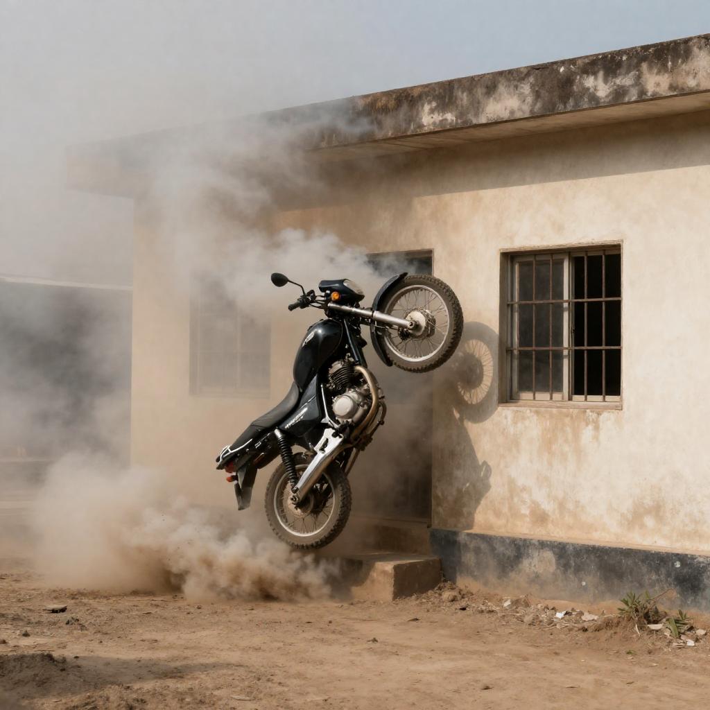 A black motorcycle with its rider crashes into a beige, ured building, creating a large cloud of gray smoke. The building has a small, barred window on the right and a plain door. The motorcycle is airborne, with its front wheel up. The rider's face is not visible due to the smoke. The ground is covered in dirt.