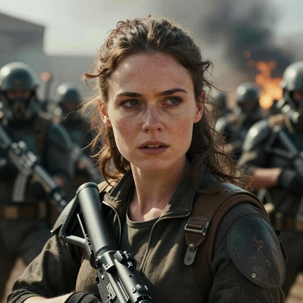 Photograph of a battle-worn, determined woman with dirty blonde hair, scarred face, and armor, standing in a ruined, sunlit,