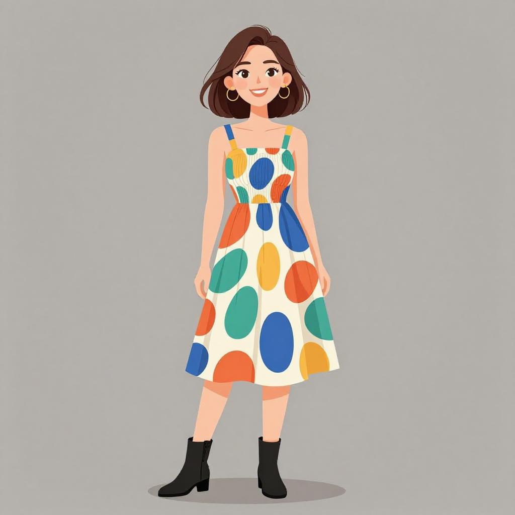 Digital illustration of a smiling young woman with shoulder-length brown hair, wearing a black floral dress and black ankle boots.
