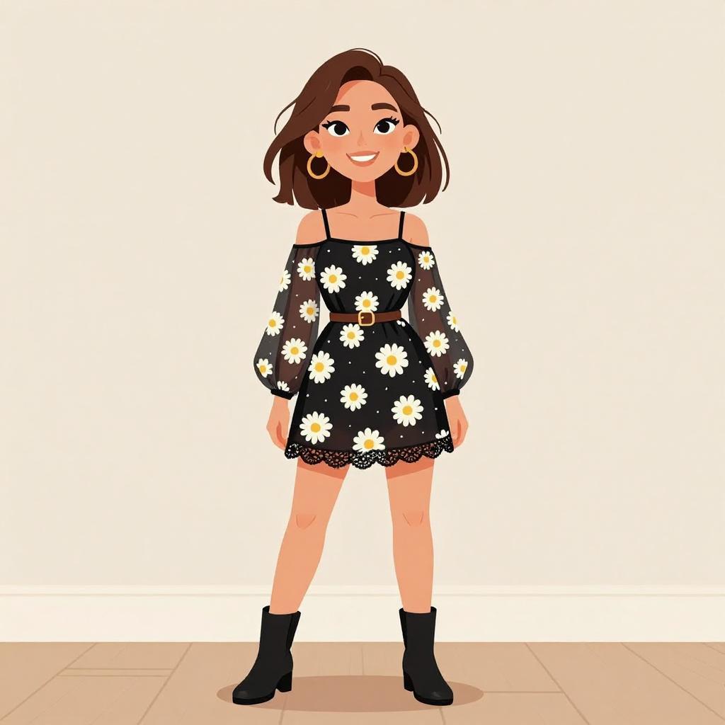 Digital illustration of a smiling young woman with light skin and shoulder-length brown hair. She wears a sleeveless, black dress adorned with white daisy flowers, and black lace-up ankle boots. Her pose is relaxed, standing with one hand on her hip. The background is plain white, highlighting her cheerful expression and floral dress. The art style is cartoonish with bold, clean lines and vibrant colors.