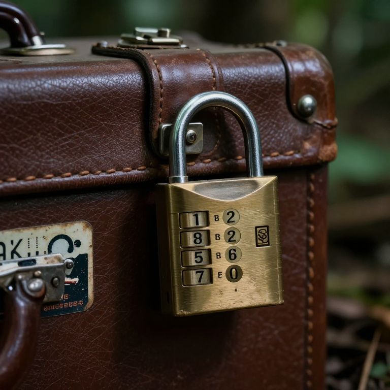 Overlap close-up of a number lock on an old leather briefcase you’ve just found in an abandoned jungle cabin. There is a sticker on the suitcase. Atmospheric lighting.,
