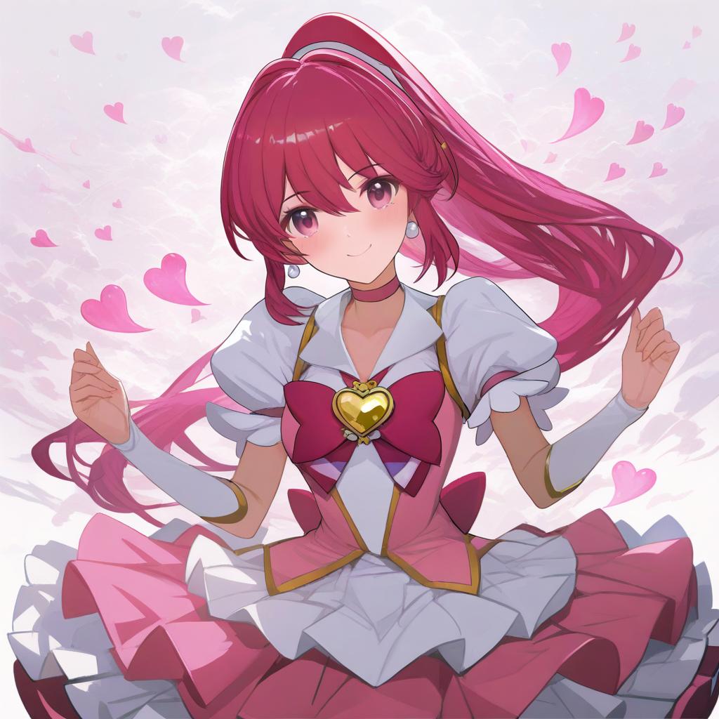 Aino megumi, happinesscharge precure!, 1girl, pink eyes, pink hair, long hair, ponytail, wide ponytail, pink skirt, magical girl, magical girl, heart brooch, by artist sunnysideup, anime