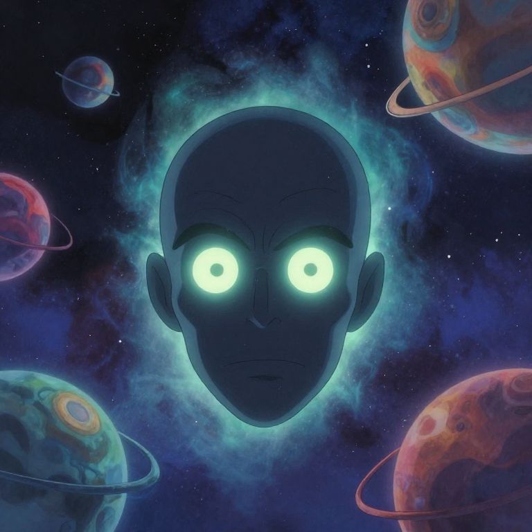 Megamind face in a surreal dream-like setting, floating in a starry void, glowing eyes, soft glowing aura, abstract background with floating planets, ethereal color blending, dreamy texture, studio Ghibli influence, magical realism, soft lighting