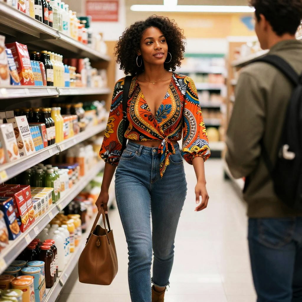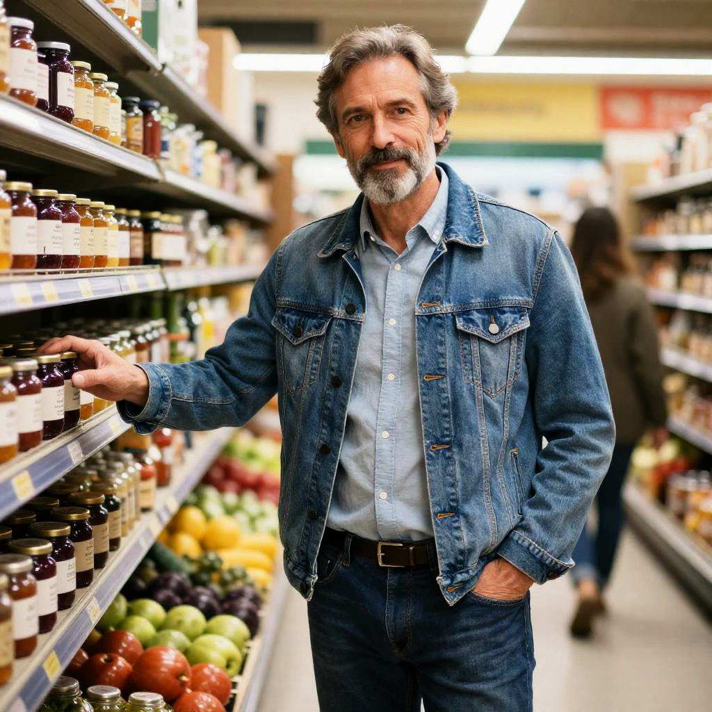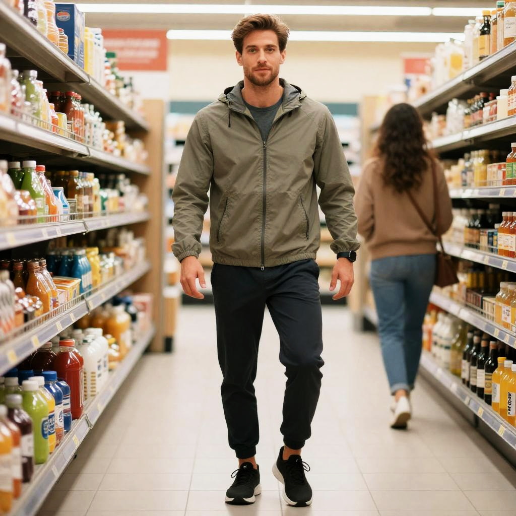 A confident 30-year-old man in a casual button-up shirt and chinos is shopping in a bustling grocery store, making direct eye contact with a passerby and radiating energy.