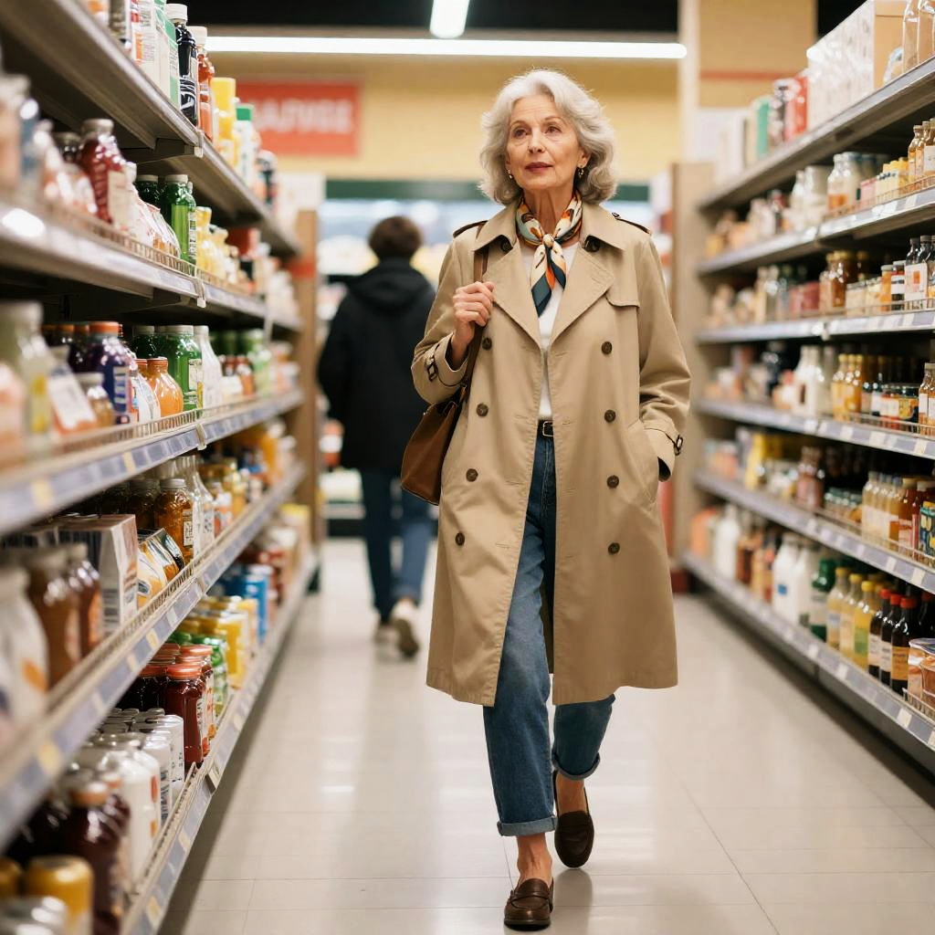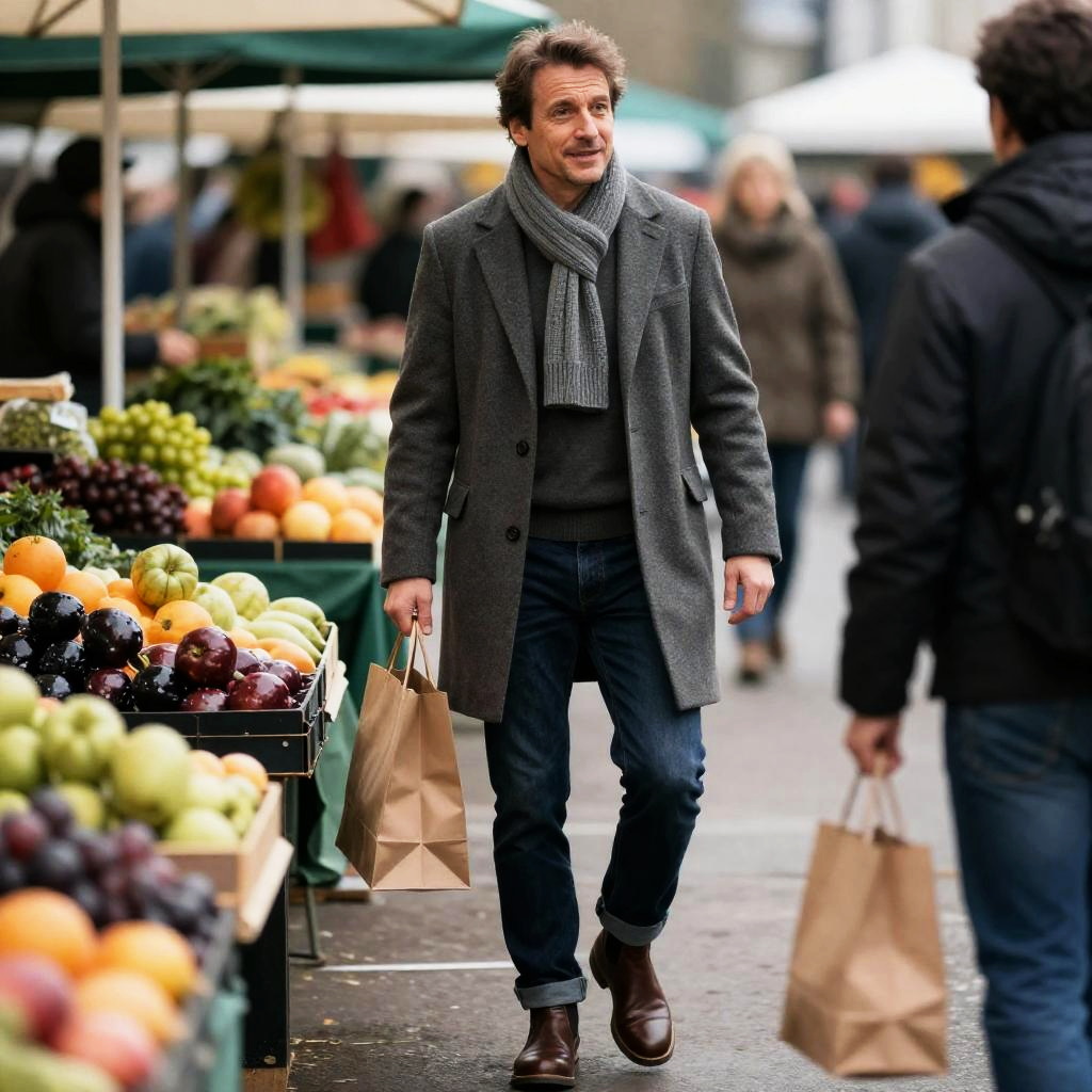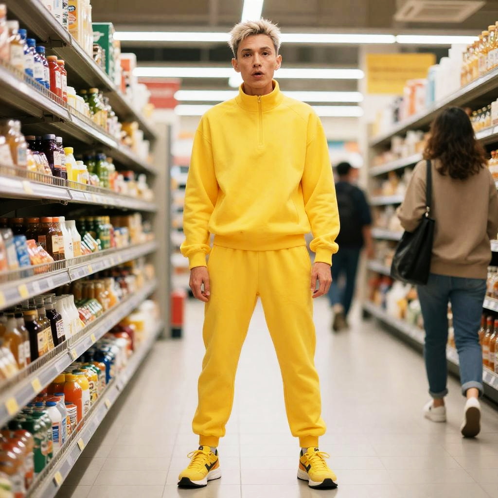 A confident 30-year-old man in a casual button-up shirt and chinos is shopping in a bustling grocery store, making direct eye contact with a passerby and radiating energy.