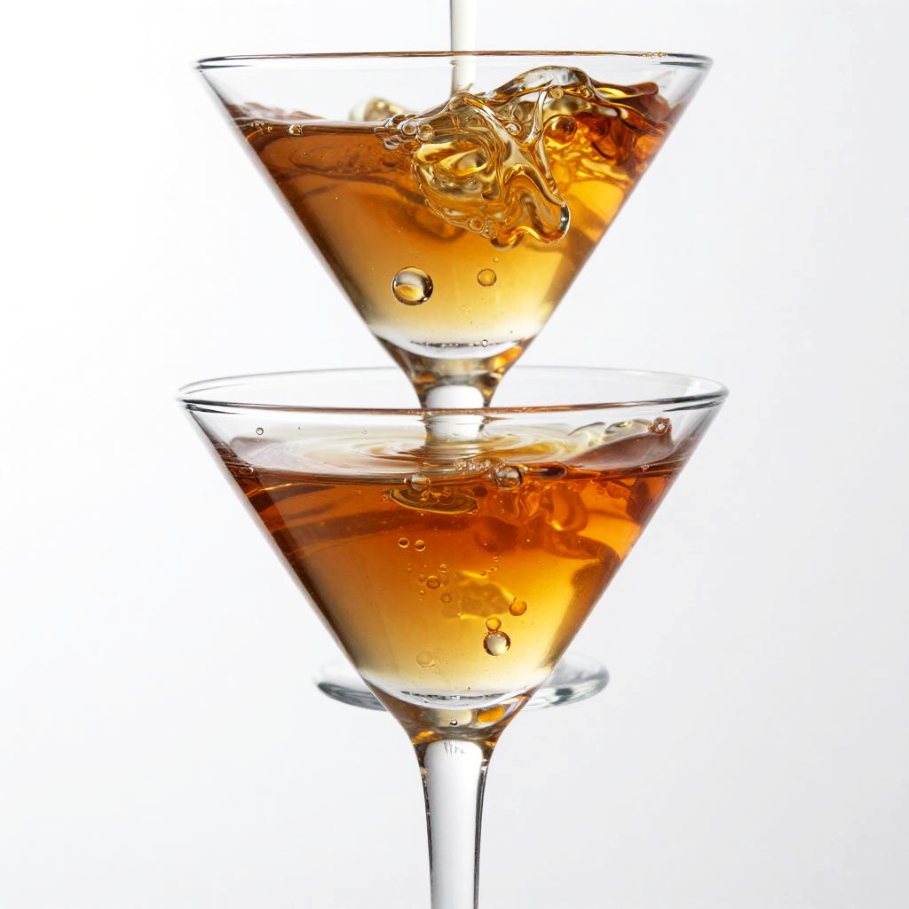 Photograph of two martini glasses stacked vertically against a white background. The upper glass is being filled with amber-colored liquid, causing bubbles to form and splash within it. The lower glass is already filled with the same amber liquid and has bubbles visible inside. Both glasses are clear, with a classic martini shape and thin stems. The liquid has a rich, golden-brown hue, and the bubbles add a sense of motion and texture to the image. The lighting is bright, highlighting the transparency and reflections on the glass surfaces.