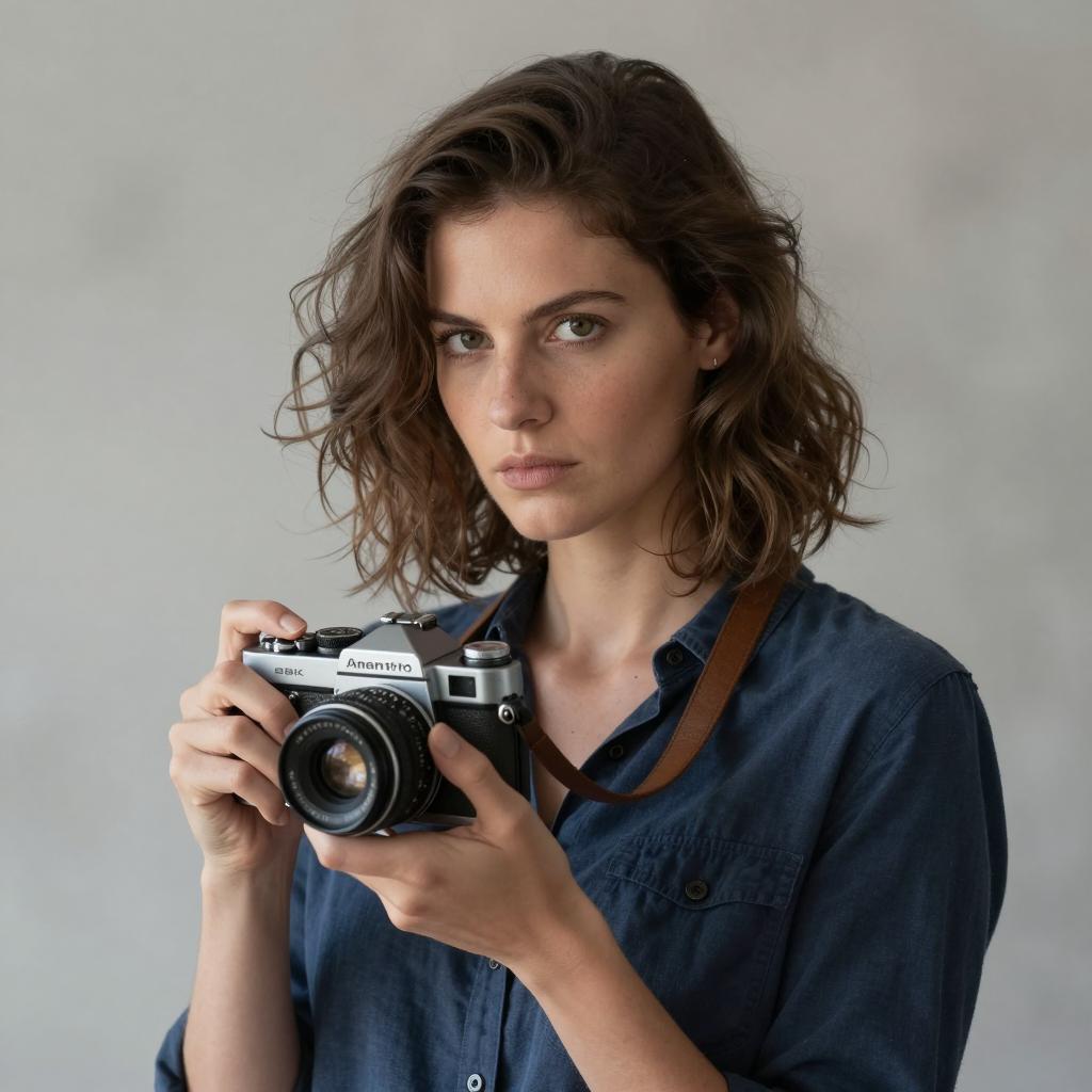 Black and white photograph of a woman with short, styled hair, wearing a dark fur coat, holding a vintage camera close to her face, smiling slightly. Background includes a blurred, indistinct structure with a pointed roof.