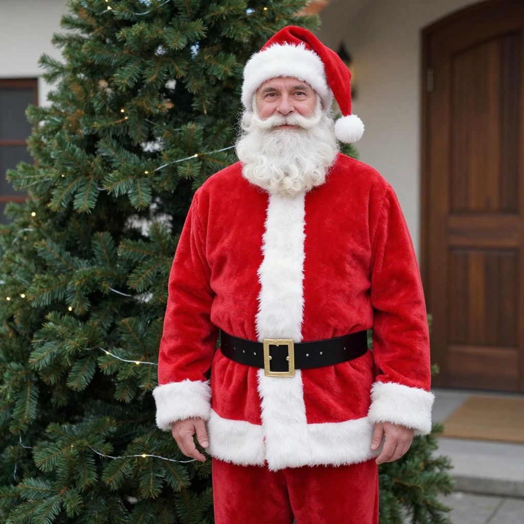 Santa Suit Costume Man, santa claus is standing in front of a christmas tree outside