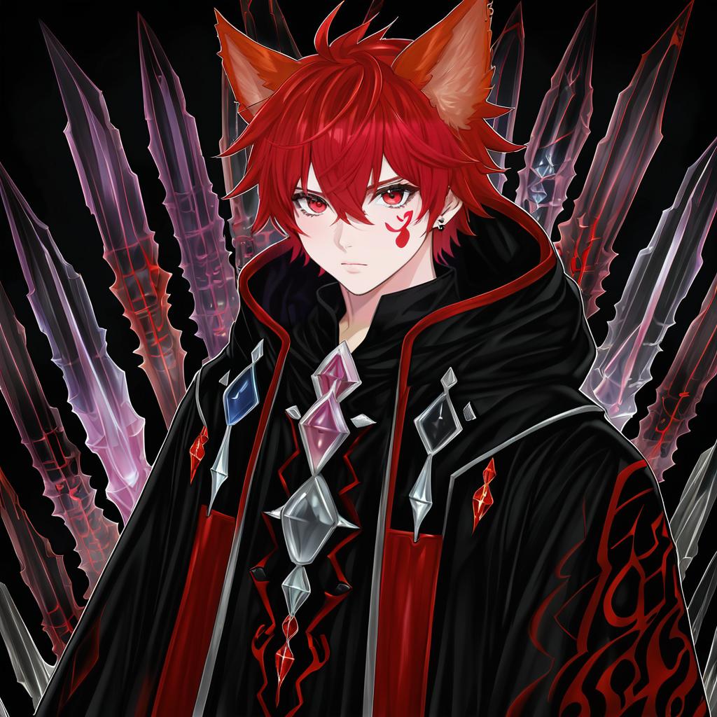 Crystal exarch, final fantasy, 1boy, cat boy, cat ears, red eyes, hair between eyes, slit pupils, red hair, short hair, hooded robe, black robe, hooded robe, black robe, hood down, miqo'te, material growth, facial mark, crystal, by artist mizukoshi (marumi), anime