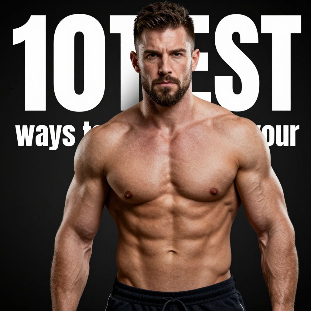 Muscular man with defined abs and a beard stands shirtless against a dark background, accompanied by bold text reading \"10 ways to increase your TEST.\