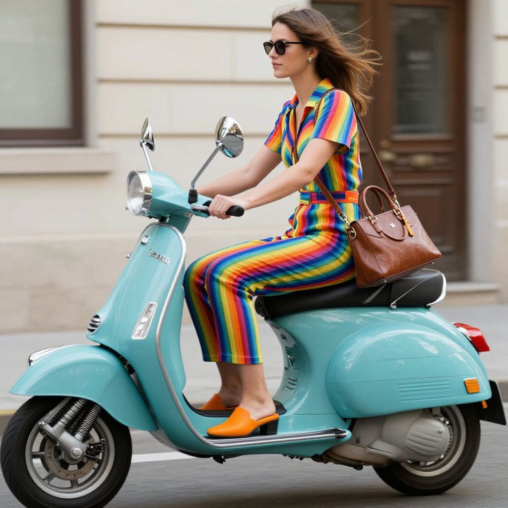 Fashionable woman riding a turquoise Vespa scooter, wearing a vibrant rainbow-striped jumpsuit paired with orange mules and carrying a brown leather handbag slung over her shoulder.